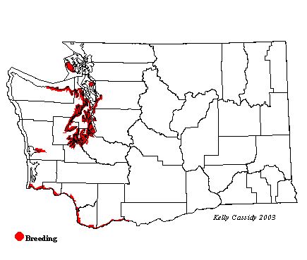 Strictly a western Washington species, the Purple Martin is the state's least common swallow. Purple Martins can be found from mid-April to late August in localized areas, mostly over water. Small populations use nest boxes or pilings around the Puget Sound, for example on Vashon Island (King County), in Tacoma (Pierce County), on Shilshole Bay and the Duwamish River in Seattle (King County), at Port Townsend (Jefferson County), and on Camano Island (Island County). They also can be found nesting in natural cavities on Fort Lewis (Pierce County) and on San Juan Island (San Juan County). Others can be found along the Columbia Estuary (Pacific County).