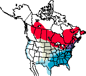 Most populations of White-throated Sparrows are migratory, although there is some overlap of breeding and wintering ranges. They arrive on the central Canadian breeding grounds in the spring, soon after the snow has melted enough to expose the forest floor. In the fall, they migrate late, usually not until snow starts to fall. Wintering range is across the southeastern and entire western coast of the United States. Birds that winter on the West Coast probably breed in northern British Columbia, but migration routes are not well documented.