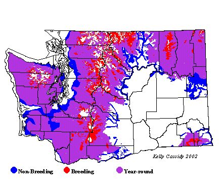 American Dippers are common year round throughout the mountainous areas of the state, and in many forested lowlands in western Washington out to the outer coast. They are most common at mid-elevations, although in winter they may become concentrated at lower elevations. They are rare, but may breed in the San Juan Islands. In the Blue Mountains of southeastern Washington, American Dippers are restricted to larger rivers. They are typically found up to or just over 5,000 feet in the Olympics, but have been found over 5,000 feet on Mount Rainier.