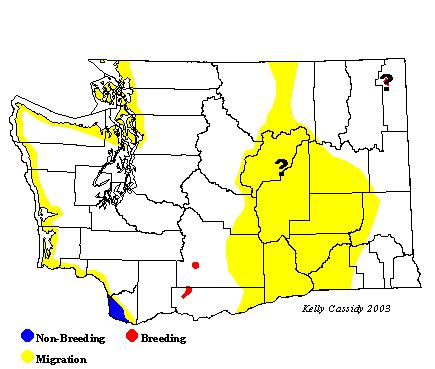 There are two confirmed nesting spots for Sandhill Cranes in Washington, one at Conboy Lake National Wildlife Refuge (Klickitat County) and the other near Signal Peak on the Yakama Indian Reservation (Yakima County). Cranes were first reported at Conboy in 1975, when a single pair nested. Subsequently, a single pair was reported at Conboy each year until 1988, but from 1988 until 1996, 2-9 pairs nested there each year. In 1994 and 1995, another single pair of cranes was found nesting on the Yakima Indian Reservation, and in 1996, a second pair joined them. Sandhill Cranes were also recorded in June, 1996 at Atkins Lake in Douglas County, which may indicate a third breeding area, although breeding in this area was not confirmed. During migration, however, large numbers of Sandhill Cranes can be seen at stopover sites in the Columbia Basin. Sandhill Cranes migrating to northwestern Canada and Alaska stop in eastern Washington near Othello (Adams County) and west to Royal City (Grant County), with peak numbers reaching 15,000 in early April. After refueling, they often also stop near Mansfield (Douglas County) before continuing north through the Okanogan Valley. Some cranes migrate on the west side of the Cascades, moving north through the Puget Trough or along the coast. In the fall, cranes use similar routes to make their way south. Ridgefield National Wildlife Refuge and nearby agricultural fields in southwest Washington are regular wintering spots.