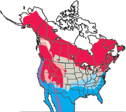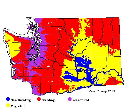 The two subspecies of Yellow-rumped Warbler are present in varying numbers at different times of the year. The Audubon's form breeds in coniferous forests throughout the state. This form is most common in drier forests at higher elevations in eastern Washington, and in the northeast Olympics. Most Audubon's Yellow-rumped Warblers leave Washington in the winter, but they can be very common in winter in the Tri-Cities area (Richland, Pasco, Kennewick), and are uncommon in other lowlands throughout the state. The Myrtle form of Yellow-rumped Warbler is a common migrant and winter resident in Washington. There are no records of this Alaskan breeder nesting in Washington. The Myrtle form is most common in winter on the southern coast of Washington, from Ocean Shores (Grays Harbor County) southward.